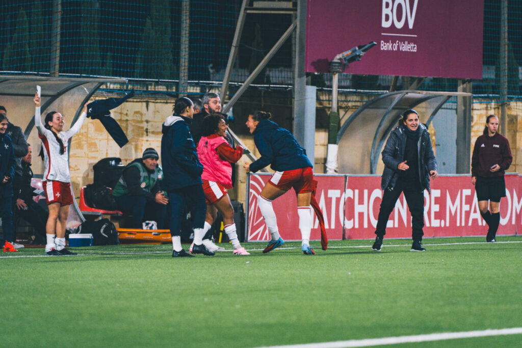 The home side support were celebrating, but the team was not done just yet. With momentum shifting once more, Malta earned the lead again two minutes later. Rachel Cuschieri opted to keep a mid-pitch free-kick simple to Maria Farrugia. She roped in Rebecca Bajada who returned the pass, before the Gozitan shifted play centrally toward Leah Ayres. She combined with Sara Saliba who sensed Maria Farrugia’s continued run into the box. The forward shifted it onto her left for space before rattling the crossbar with the left-footed effort. It earned the confirmation of breaching the goal line from the referees, completing Malta’s charge back into the lead in the 82nd minute.