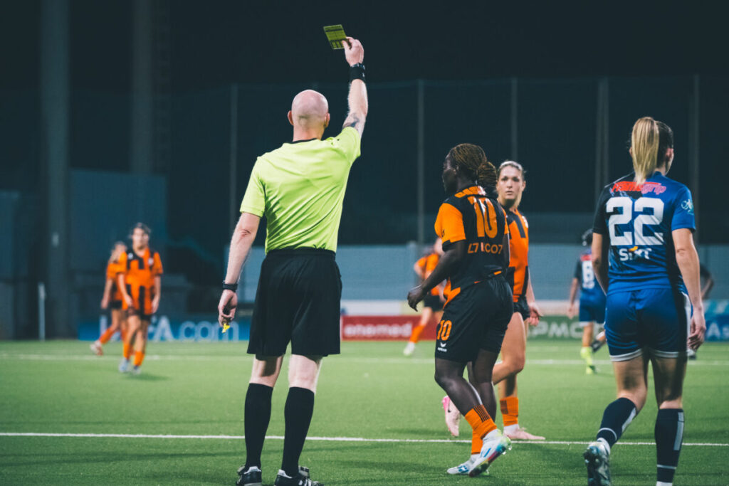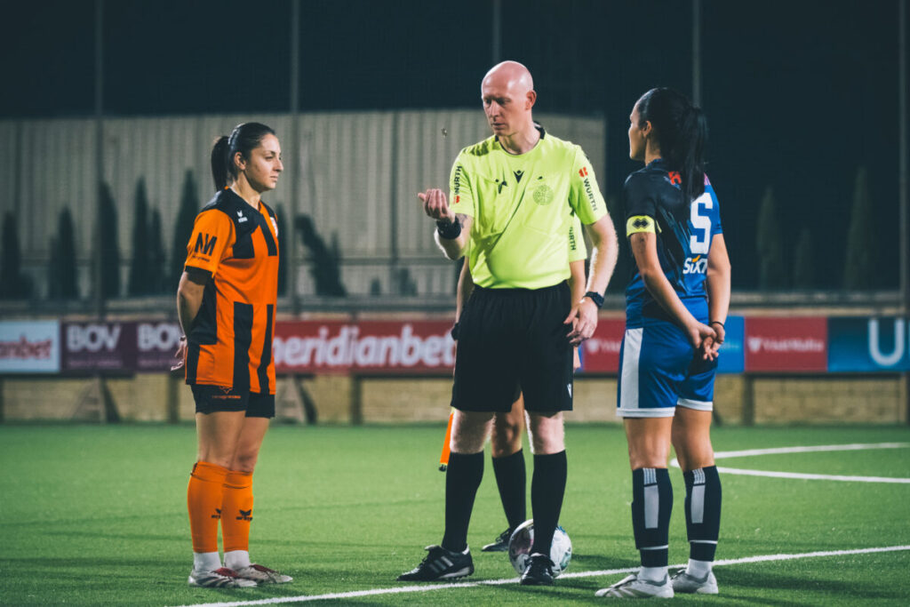 Scott Harrison continued getting more involved with the players, coaches and the crowd on his back. Tammy Falzon got a lecture, before Salamatu Abdulai was booked for diving in the box, to the applause of the Greens’ support. Dorianne Theuma also got a stern warning, with tensions running high as the half drew to a close.