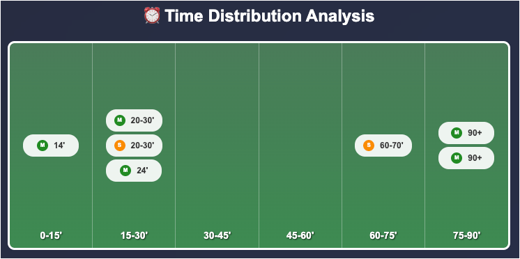 It is difficult to predict the nature of football, especially between two sides meeting in a final for the first time. However, the statistics suggest that you may want to avoid getting away from your seat anywhere close to the fifteen to thirty-minute marks. Four goals out of seven have arrived in those moments. The last moments of normal time may be crucial as well as a further two goals arrived after the ninety in injury time, one of which was a deciding penalty.